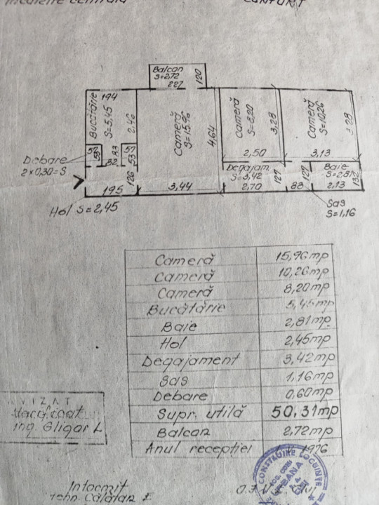 Compartimentarea este semidecomandată, suprafața utilă este de 50.31 mp. și se prezintă astfel: bucătărie, living, 2 dormitoare, hol, baie și balcon de 3 mp.